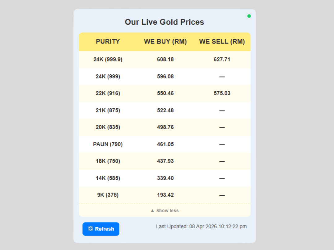 Our buy and sell gold prices are among the most competitive in Malaysia. We pay based on actual gold weight multiplied by the current market rate, with no hidden deductions or fees.